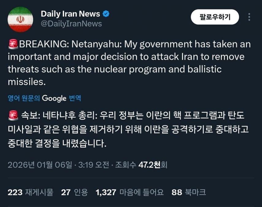 | * | [소셜] | 이스라엘, 이란 공격 선언 | 카와이데쓰 | 2026/01/06 |