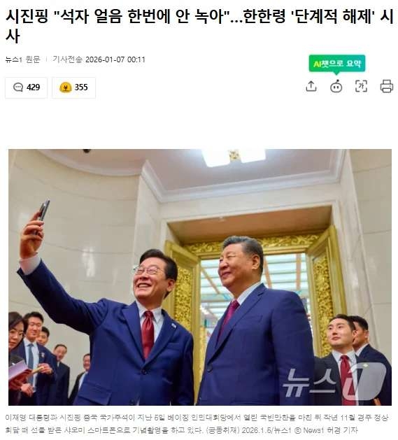 | * | [소셜] | 시진핑 "석자 얼음 한번에 안 녹아"…한한령 '단계적 해제' 시사 | wookwayDda | 2026/01/07 |
