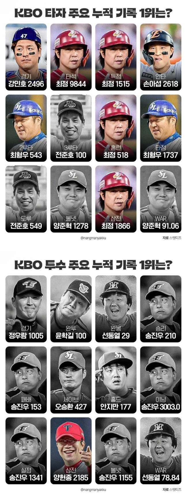 * [스포츠] 크보 누적 기록 1위 선수들 피자맛피자 2026/01/12