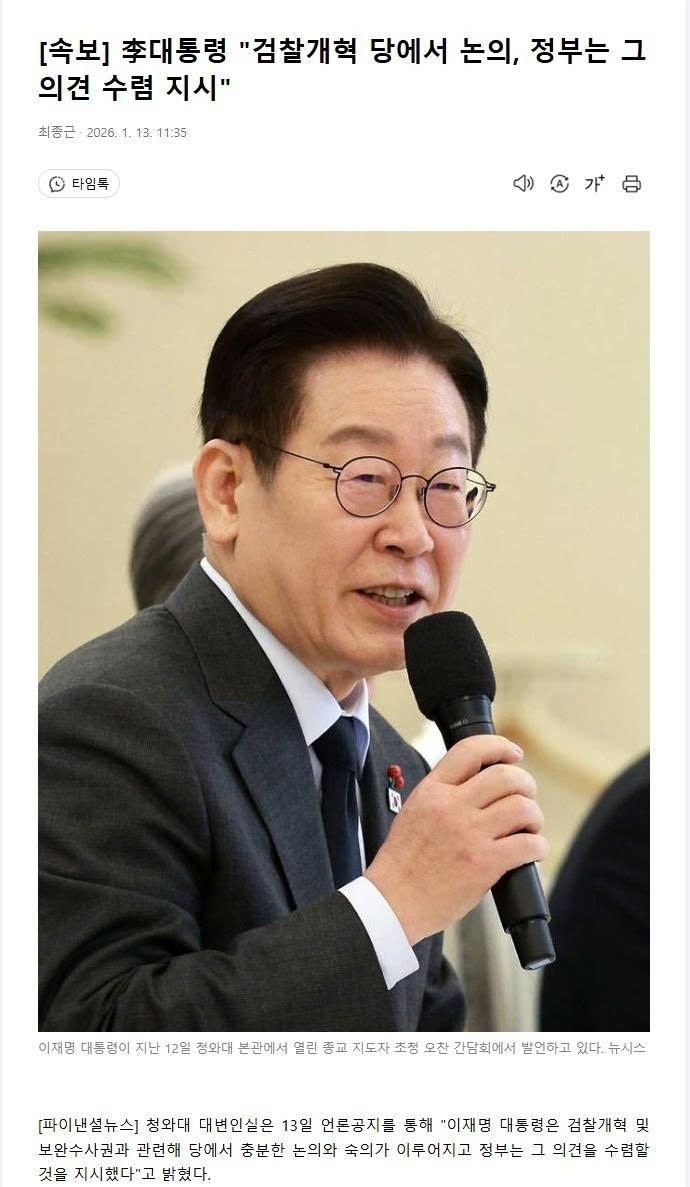| * | [소셜] | 이 대통령 "검찰개혁 당에서 논의, 정부는 그 의견 수렴 지시" | 팔라이니야 | 2026/01/13 |