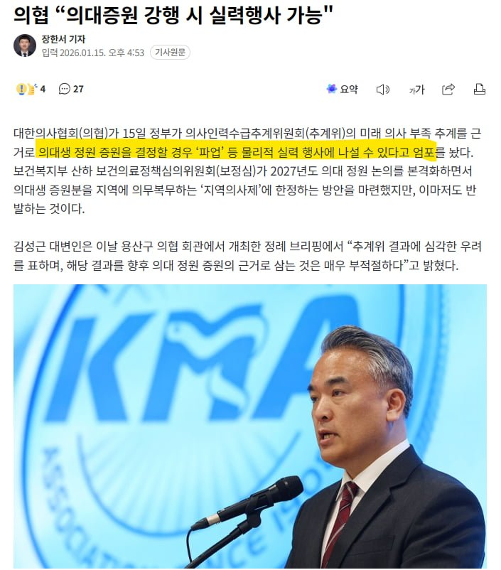 | * | [소셜] | 의협 "의대증원 강행 시 실력행사 가능" | 발광하는심술 | 2026/01/15 |