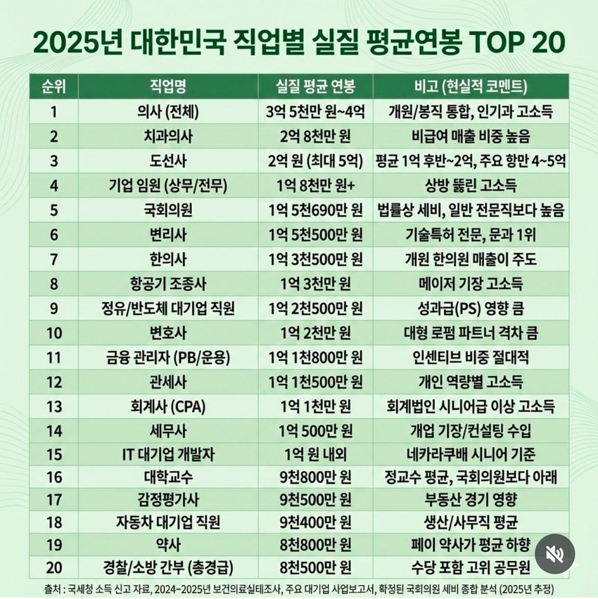 * [머니] 2025년 대한민국 실질연봉 순위 살라딘 2026/01/18