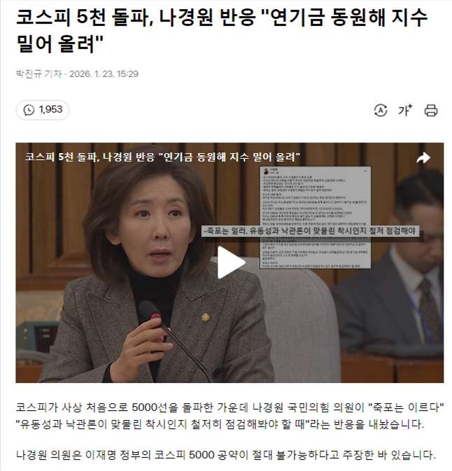 | * | [머니] | 코스피 5천 돌파, 나경원 반응 "연기금 동원해 지수 밀어 올려" | supermass | 2026/01/23 |