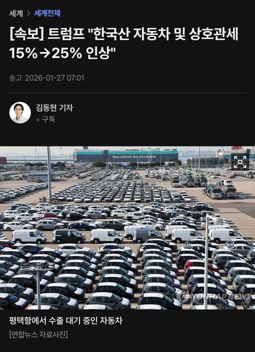 | * | [머니] | 도람푸 "한국산 자동차 및 상호관세 25%로 인상" 땜시 난리 | venaonnom | 2026/01/27 |