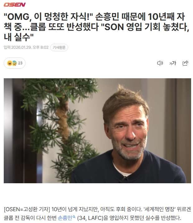이어 클롭은 "손흥민이다. 내가 그 기회를 놓쳤다. 내 명백한 실수였다. 그때 충분히 밀어붙이지 못했다. 놓치지 않았다면 좋았을 텐데, 나중에는 더 이상 영입할 수가 없었다"라고 씁쓸해했다.