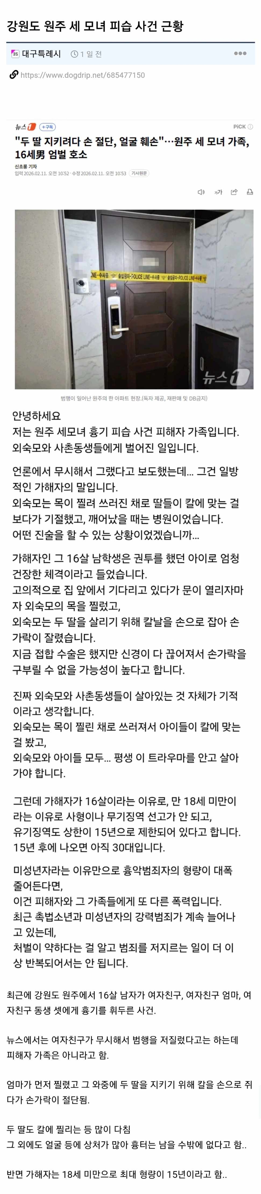 | * | [소셜] | 원주 세 모녀 피습사건 근황 | 닥터소맥이 | 2026/02/13 |