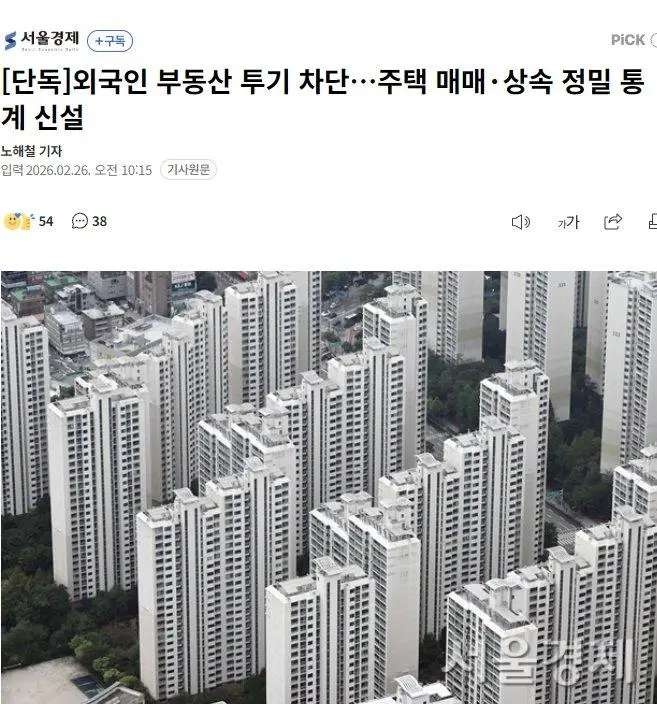 | * | [머니] | 외국인 부동산 투기 차단…주택 매매·상속 정밀 통계 신설 [1] | 이노세의우울 | 2026/02/26 |