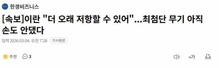 | * | [소셜] | 이란 "더 오래 저항할 수 있어"...최첨단 무기 아직 손도 안댔다 [1] | 양밤갱2개 | 2026/03/04 |
