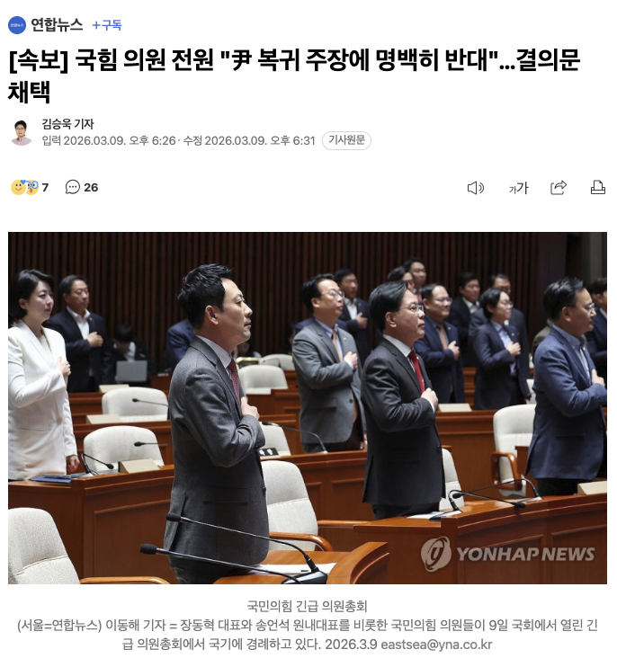 | * | [소셜] | 국힘 의원 전원 "尹 복귀 주장에 명백히 반대" [1] | ionme | 2026/03/09 |