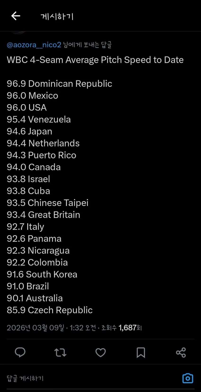 | * | [스포츠] | WBC 참가국 평균 구속 순위 | supermass | 2026/03/09 |