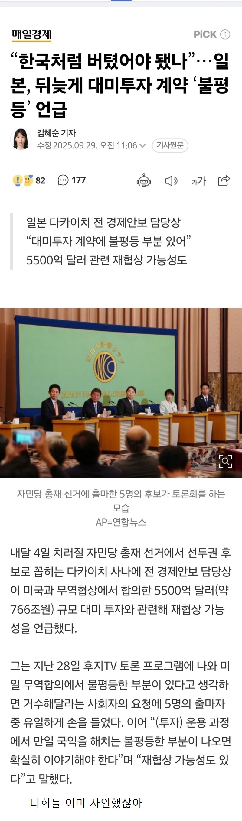 일본이 성급하게 도장 안찍었으면 한일 연합해서 더 좋은 조건을 끌어낼 수 있었을텐데