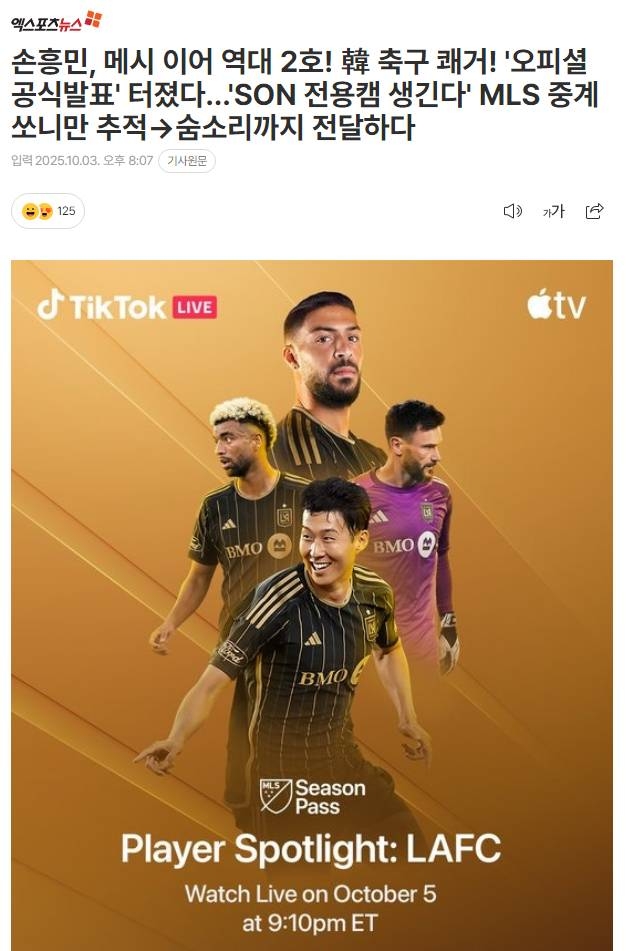 LAFC와 애틀랜타 유나이티드의 경기에 플레이어 스포트라이트(Player Spotlight)가 적용된답니다. 이게 뭐냐면 MLS와 애플TV, 틱톡이 협업해 선보이는 생중계 서비스입니다. 경기 전체를 선수 중심으로 보여주는 점이 특징이고요.