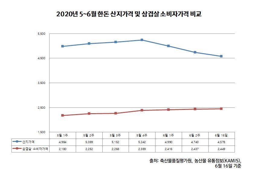 그러나 농산물 유통정보(KAMIS) 기준 삼겹살의 소비자 가격은 산지 가격의 하락에도 100g당 2449원까지 올라가며 같은 기간 7.98% 증가했다.