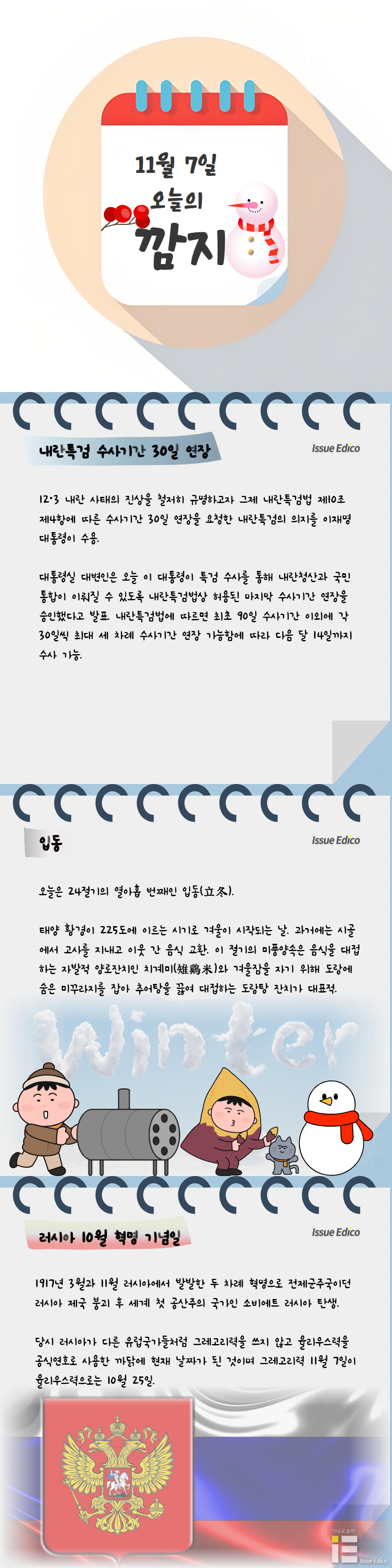 오늘은 24절기의 열아홉 번째인 입동(立冬). 태양 황경이 225도에 이르는 시기로 겨울이 시작되는 날. 과거엔 시골에서 고사를 지내고 이웃 간 음식 교환. 이 절기의 미풍양속은 음식을 대접하는 자발적 양로잔치인 치계미(雉鷄米)와 겨울잠을 자기 위해 도랑에 숨은 미꾸라지를 잡아 추어탕을 끓여 대접하는 도랑탕 잔치가 대표적.
