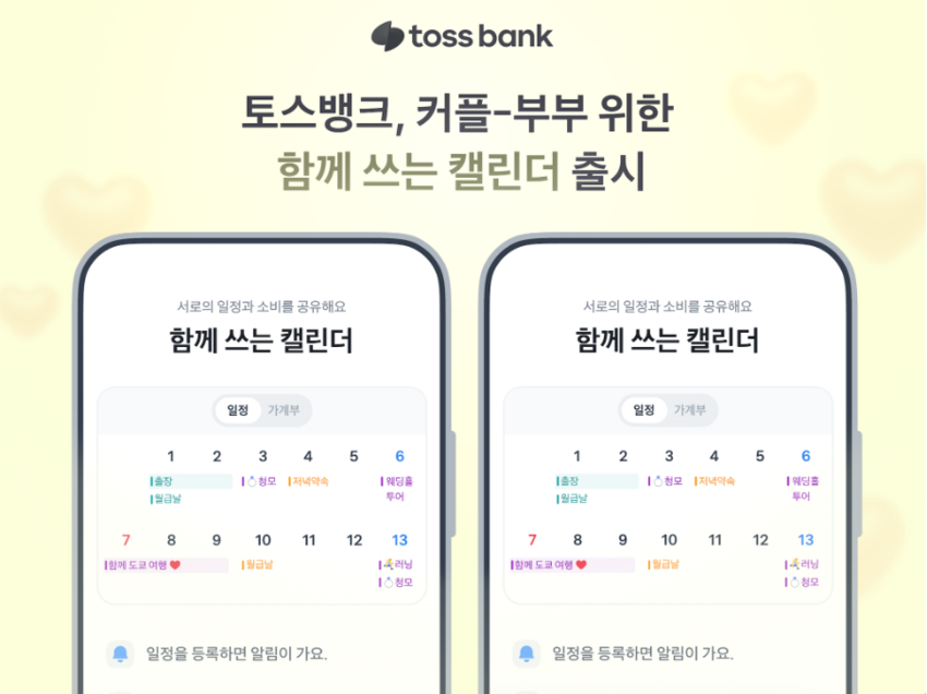 [IE 금융] 토스뱅크가 모임통장에 이어 커플·부부가 일정과 소비 내역을 함께 관리할 수 있는 '함께 쓰는 캘린더'를 통해 생활 공유형 금융' 서비스 강화.