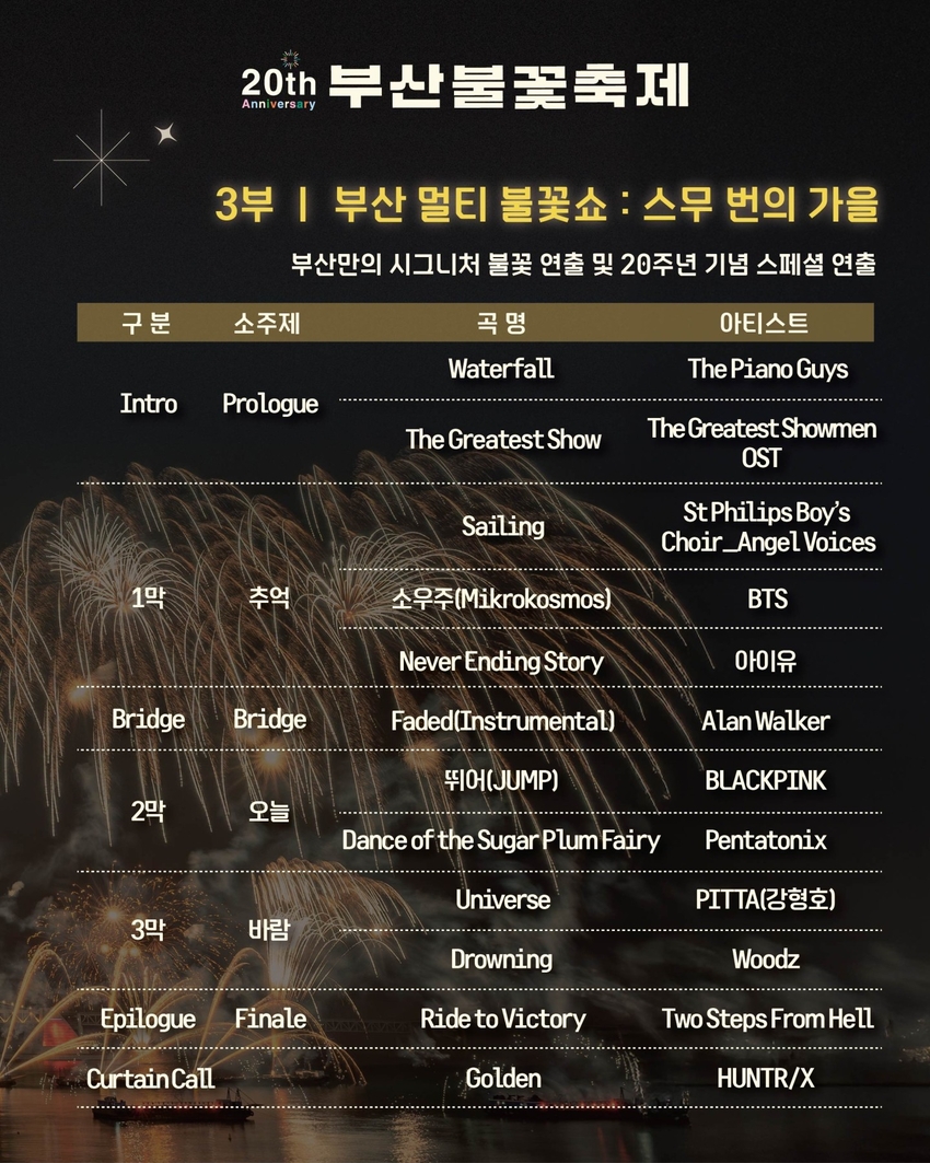 한편 더욱 상세한 행사 관련 정보는 축제 안내 홈페이지(https://busanfireworks.com/)에서 확인할 수 있으며 기타 사항은 부산문화관광축제조직위원회(051-713-5000) 및 바로콜센터(051-120)로 문의.