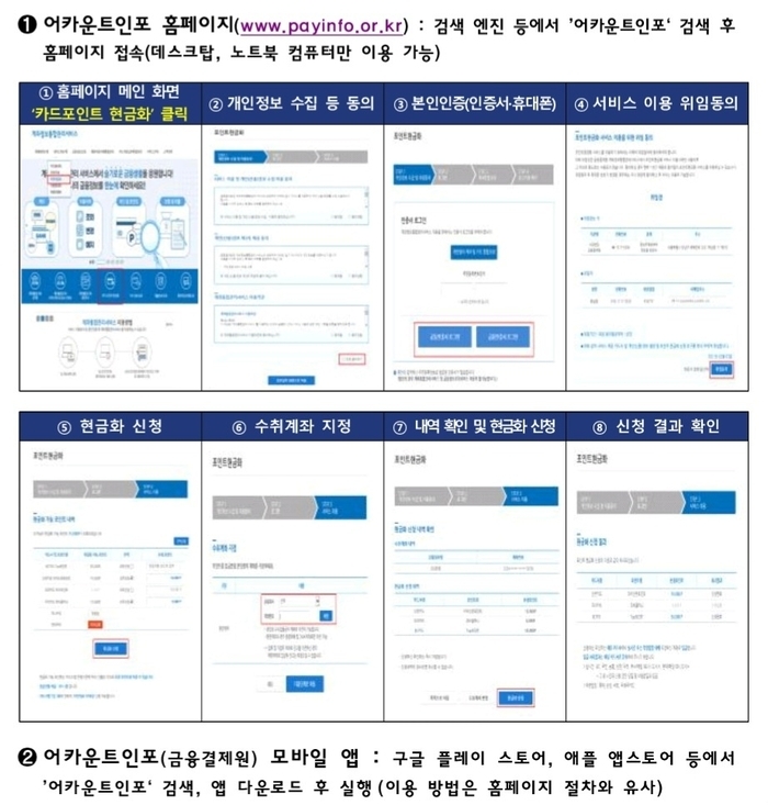 금융위원회와 여신금융협회가 지난 2021년 1월부터 운영 중인 '카드 포인트 통합조회 및 계좌 입금 서비스'를 통해 모든 카드사의 잔여 포인트를 한 번에 조회하고 카드 포인트를 현금으로 전환 가능. |
