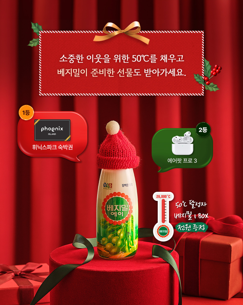 개인 누적 온도 50℃를 달성한 참여자에게는 베지밀 랜덤 1박스가 제공되며 추첨을 통해 ▲휘닉스파크 숙박권 ▲에어팟 프로3 ▲편의점 1만 원권 등 추가 경품도 제공. 이번 캠페인은 총 2만6000개 기부를 목표로 하며, 기부 물품은 대한사회복지회를 통해 소외이웃에게 전달할 예정.
