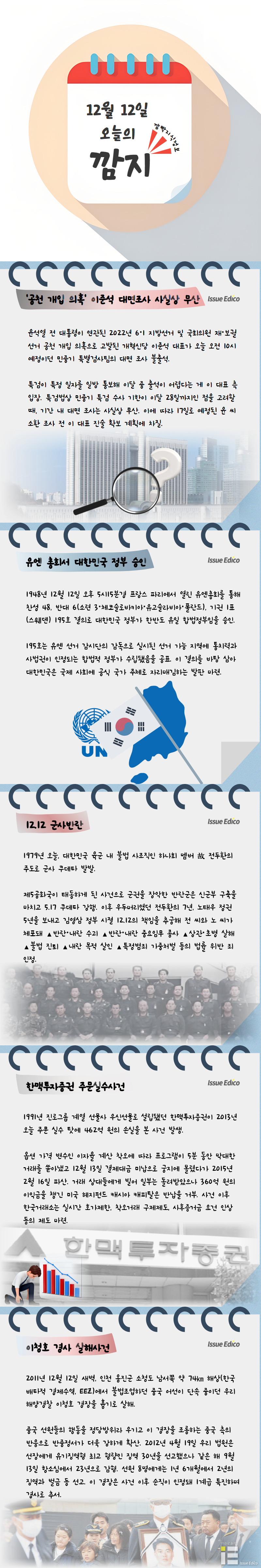 1979년 12월 12일, 대한민국 육군 내 불법 사조직인 하나회 멤버 故 전두환 주도로 군사 쿠데타 발발. 제5공화국이 태동하게 된 사건으로 군권 장악을 이룬 반란군은 신군부 구축을 마치고 5.17 쿠데타 강행. 이후 우두머리였던 전두환 7년, 노태우 정권 5년을 보내고 김영삼 정부 시절 12.12의 책임을 물어 전 씨와 노 씨가 체포돼 ▲반란·내란 수괴 ▲반란·내란 중요임무 종사 ▲불법 진퇴 ▲상관·초병 살해 ▲내란 목적 살인 ▲특정범죄 가중처벌 등에 관한 법률 위반 등의 죄를 인정.