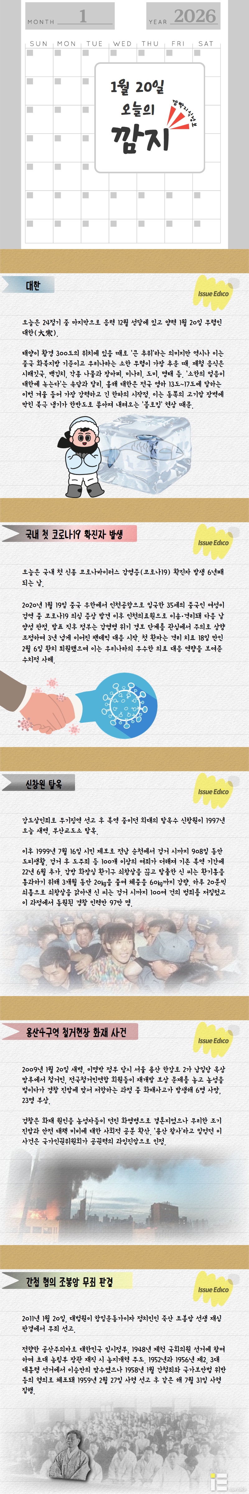 오늘은 24절기 중 마지막으로 음력 12월 섣달에 있으며 양력 1월 20일 무렵인 대한(大寒). 태양이 황경 300도의 위치에 있을 때로 ‘큰 추위’라는 의미지만 역시나 이는 중국 화북지방 기준이고 우리나라에서는 소한 무렵이 가장 추운 때. 제철 음식은 시래깃국, 백김치, 각종 나물과 장아찌, 미나리, 도미, 명태 등. '소한의 얼음이 대한에 녹는다'는 속담과 달리, 올해 대한은 전국 영하 13도~17도에 달하는 이번 겨울 들어 가장 강력하고 긴 한파의 시작점. 이는 동쪽의 고기압 장벽에 막힌 북극 냉기가 한반도로 쏟아져 내려오는 '블로킹' 현상 때문.
