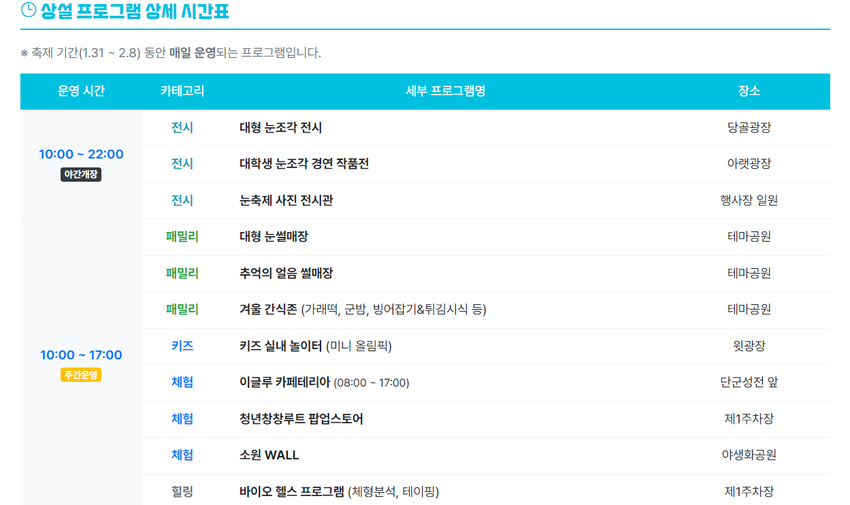 축제장은 오전 10시부터 오후 5시까지 꾸려지며 9일간 다채로운 볼거리와 즐길거리로 방문객 맞이 예정. 핵심 프로그램인 눈조각 전시는 태백의 지역 콘텐츠와 대한민국 K-콘텐츠를 결합한 '스노우 랜드(Snow Land)'로 조성.