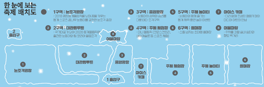 올해는 2026 밀라노·코르티나 동계올림픽 개최 시기에 맞춰 기획됐으며 '2018 평창 동계올림픽'을 보고 스포츠 국가대표를 꿈꾸던 평창 마스코트 '눈동이'가 올해 동계올림픽의 국가대표로 거듭나는 과정을 초대형 눈조각과 얼음조각으로 생생하게 표현. 단순 관람을 넘어 이야기를 따라 걷는 회귀형 동선을 도입해 공간의 몰입감을 높여 행사 전부터 관심 점증.