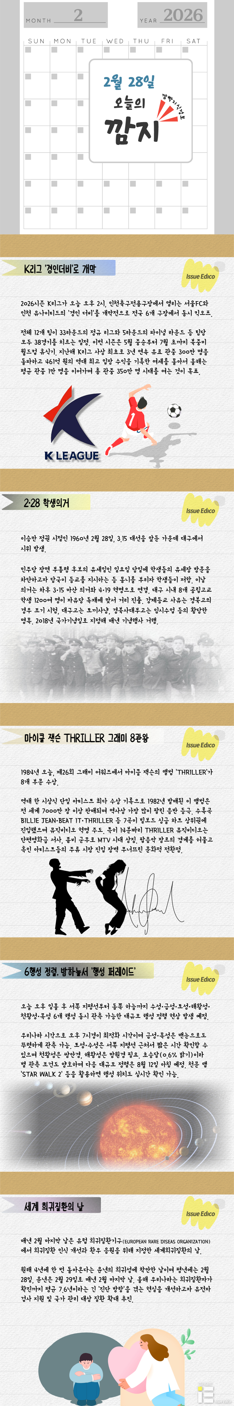 2026시즌 K리그가 오늘 오후 2시, 인천축구전용구장에서 열리는 인천 유나이티드와 서울FC '경인 더비'를 개막전으로 전국 6개 구장에서 동시 킥오프. 12개 팀이 33라운드의 정규 리그와 5라운드의 파이널 라운드 등 팀당 총 38경기를 치르는 일정. 이번 시즌은 5월 중순부터 7월 초까지 북중미 월드컵 휴식기. 지난해 K리그 사상 최초로 3년 연속 유료 관중 300만 명을 돌파하고 461억 원의 역대 최고 입장 수익을 기록한 여세를 몰아 올해는 평균 관중 1만 명을 이어가는 동시에 총 관중 350만 명 시대를 여는 것이 목표.
