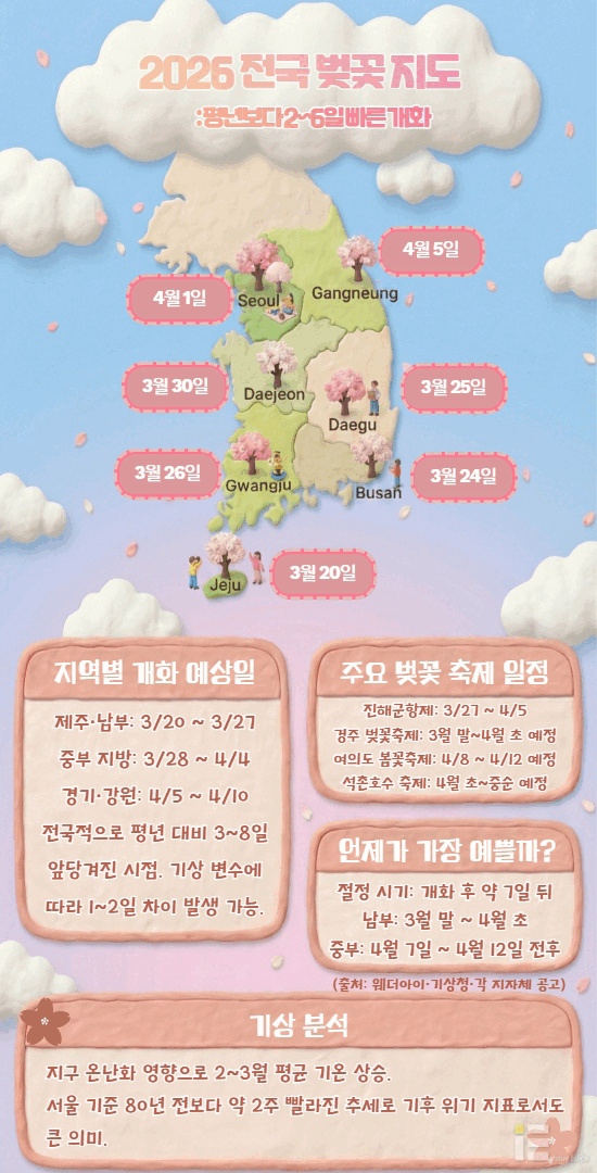지구 온난화 영향으로 2~3월 평균 기온 상승. 서울 기준 80년 전보다 약 2주 빨라진 추세로 기후 위기 지표로도 큰 의미.