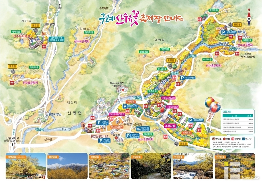추천 동선은 주행사장 도착→산수유차 무료 시음회 참여→체험부스(키링·드림캐처 만들기)→산수유 꽃길 탐방→반곡마을·현천마을 또는 상위마을 산책→무대 공연 관람 순서.
