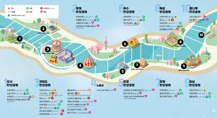 K-콘텐츠와 도시 문화가 어우러진 서울의 봄 축제로 올해는 한강을 주 무대 삼아 공연, 체험, 마켓을 하나로 묶은 복합형 구성에 눈길.