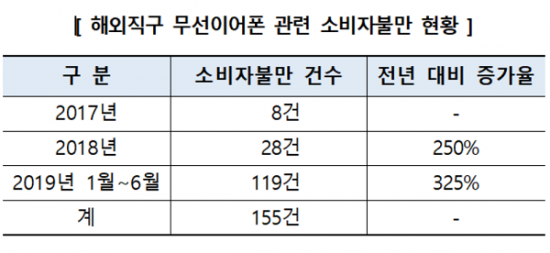 5일 한국소비자원에 따르면 지난 2017년부터 지난 6월까지 접수된 해외직구 무선 이어폰 관련 소비자 불만인 총 155건이다.