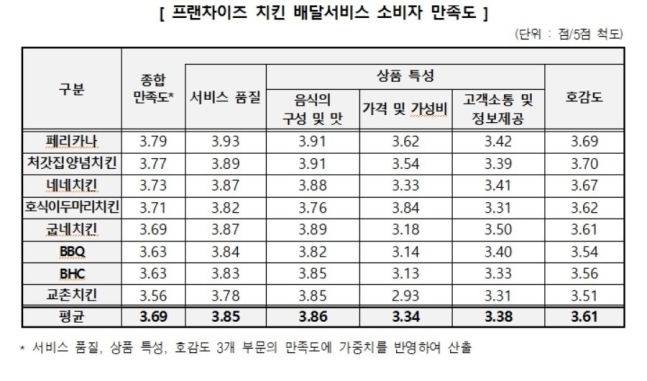 음식의 구성 및 맛에서 가장 높은 점수를 받은 프랜차이즈는 페리카나·처갓집양념치킨(3.91점)이었고 가격 및 가성비가 가장 높다고 평가받은 곳은 호식이두마리치킨(3.84점)이었다. 고객소통 및 정보제공은 굽네치킨(3.50점)이 가장 높은 점수를 받았다.