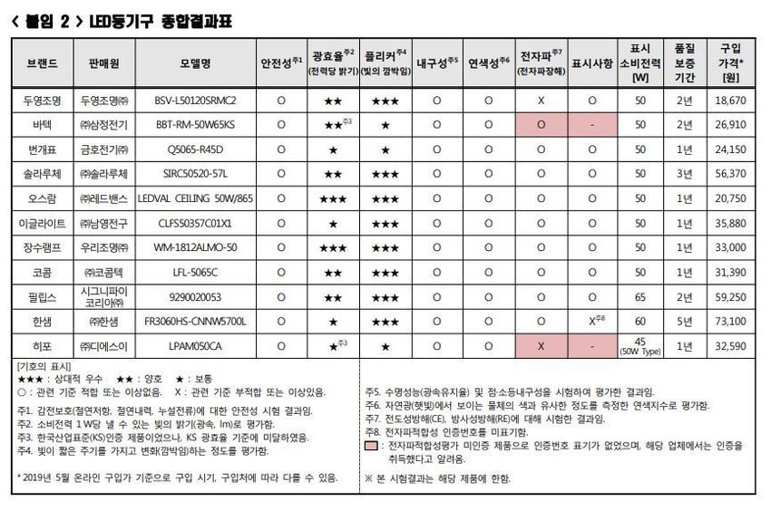 조사 대상 브랜드는 ▲두영조명 ▲바텍 ▲번개표 ▲솔라루체 ▲오스람 ▲이글라이트 ▲장수램프 ▲코콤 ▲필립스 ▲한샘 ▲히포다.
