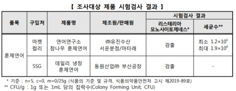 조사대상 30개 제품 중 마켓컬리에서 판매한 '연어연구소 참나무 훈제연어'와 SSG닷컴에서 팔고 있는 '데일리 냉장 훈제연어'에서 식중독균 리스테리아 모노사이토제네스가 검출됐다. 그중 '연어연구소 참나무 훈제연어' 일반세균수도 최대 1.9×106CFU/g(1g당 집락수)였다.