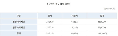 [IE 산업] 장애인의 문화 및 여가활동에 대한 관심이 높아졌으나 숙박시설 내 장애인 객실일 비롯한 장애인을 위한 편의시설은 여전히 미흡한 것으로 나타났다. 13일 한국소비자원이 발표한 '수도권 숙박시설 내 장애인 편의시설에 대한 온라인 및 현장 실태조사 결과'에 따르면 숙박시설의 절반은 장애인 객실이 없었다. 장애인·노인·임산부 등의 편의증진 보장에 관한 법률 시행령에 따라 30실 이상의 객실을 보유한 숙박시설은 전체 객실의 1%, 관광숙박시설은 객실 수와 관계없이 3% 이상 장애인, 노인, 임산부 등이 이용 가능한 객실을 보유하고 장애인을 위한 편의시설을 설치해야 한다. 그러나 장애인 객실 설치 의무가 있는 숙박시설 100개소에 대한 온라인 조사 결과, 49개소(49.0%)는 장애인이 이용 가능한 객실이 없었다. 또 장애인 객실을 설치한 51개소 중에서도 0.5% 이상~1% 미만으로 설치한 곳이 18개소(35.3%)였다. 총 객실 수가 100실 이상인 24개소 중 20개소(83.3%)는 장애인 객실을 설치하지 않거나 1개만 설치하고 있었다. 소비자원 측은 "장애인 편의시설이 설치된 객실은 장애인뿐만 아니라, 고령자·임산부 등 '관광약자' 모두 편리하게 이