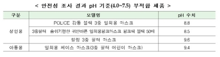 [IE 산업] 정부가 수소이온농도(pH) 기준치를 초과해 피부염 등을 유발할 수 있는 일회용 마스크 4종에 대해 리콜 권고 조치를 내렸다. 3일 산업통상자원부 산하 국가기술표준원(국표원)에 따르면 시중에 유통되는 일반용 일회용 마스크 제품(KF 보건용 및 비말차단마스크 제외) 성인용 43개, 아동용 25개 등 총 68개 제품에 대한 안전성 조사에서 성인용 3종, 어린이용 1종이 pH 기준치를 초과한 것으로 나타났다. pH가 높을 경우 알레르기성 접촉 피부염 등을 유발할 수 있다. 리콜 권고를 받은 제품은 ▲POLICE 감동 블랙 3중 일회용 마스크 ▲3중필터 숨쉬기편한 귀안아픈 일회용핑크마스크 핑크색 블랙 50매 ▲힐링 3중 필터 마스크 ▲일회용 페이스 마스크(3중 필터 어린이 마스크) 등이다. 이들 제품의 pH 수치는 8.5~9.4로 기준치 4.0~7.5를 넘어섰다. 여기 더해 국표원은 혼용률이나 안전상 유의사항 등 표시사항을 위반한 46개 제품에 대해선 개선조치를 지시했다. 다행히 폼알데하이드, 아릴아민, 노닐페놀(아동용 일회용 마스크 대상) 등 유해물질은 조사대상 68개 제품 모두에서 검출되지 않았다. 국표원은 "앞으로도 일반용 일회용 마스크 제품에 대