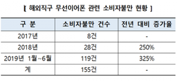 [IE 산업] 무선 이어폰의 인기로 해외직구 소비자가 급증하면서 관련 피해도 크게 늘고 있다. 5일 한국소비자원에 따르면 지난 2017년부터 지난 6월까지 접수된 해외직구 무선 이어폰 관련 소비자 불만인 총 155건이다. 관세청 통계에 따르면 올 상반기 무선 이어폰 해외직구 반입 건수는 54만6317건으로 작년 동기 4만3419건보다 12배 이상 증가했다. 이와 함께 소비자 불만은 2017년 기준 8건이었으나 올 상반기 119건까지 늘었다. 소비자 불만 내용을 분석한 결과 '품질 불량'에 대한 불만이 66건(42.6%)으로 가장 많았다. 예를 들어 A씨는 지난 1월20일 해외 구매대행 쇼핑몰에서 무선 이어폰을 구입했다. 그러나 제품을 받고 2주일이 지나자 오른쪽 이어폰 소리가 들리지 않아 교환을 요구했는데, 7일 이내 알리지 않았다며 거부당했다. 이어 미배송·배송 지연과 같은 '배송 관련' 문제는 45건(29.0%), '사업자 연락 두절·사이트 폐쇄'는 24건(15.5%)이었다. 거래금액이 확인된 109건을 분석한 결과 5만 원 미만이 44건(40.4%)으로 가장 많았으며 '15만 원 이상'이 34건(31.1%)이었다. 거래금액이 5만 원 미만인 44
